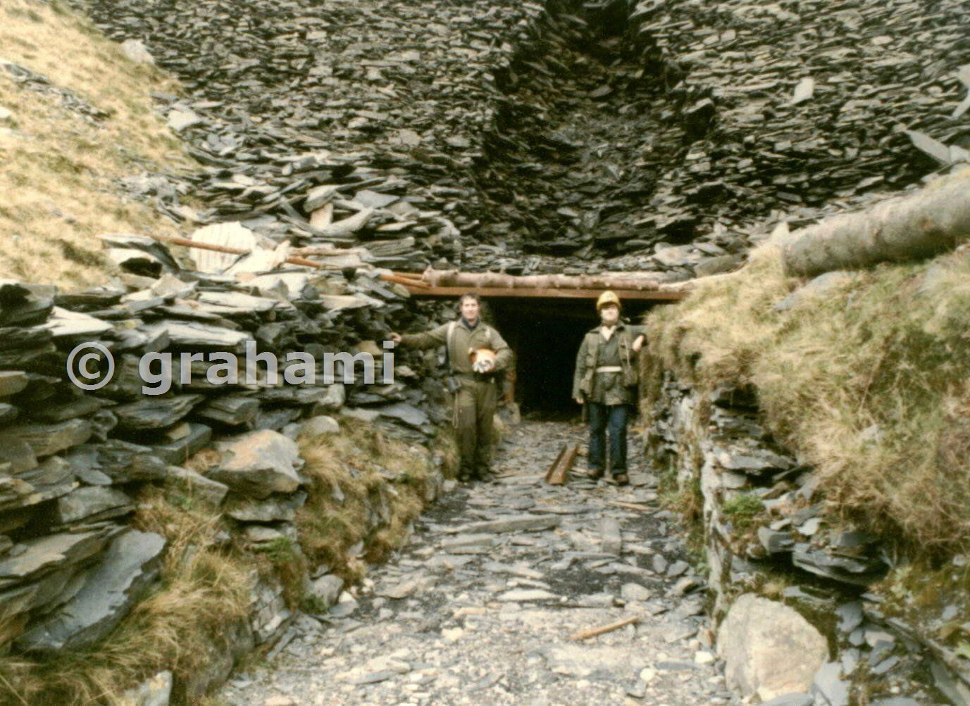 This was after the entrance had been repaired so the quarrymen could get their landrover down the level to the old compressor chamber, which they were using as a sawmill. A rather younger me is on the right.