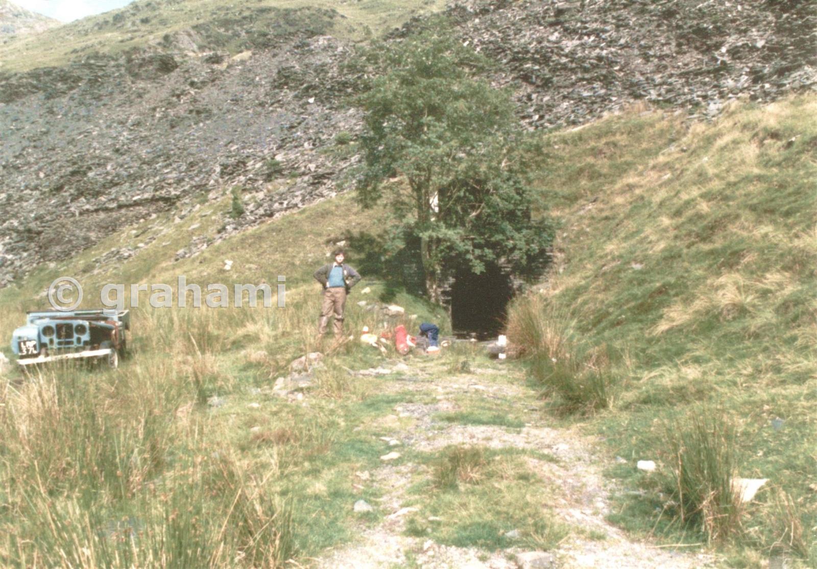 A very young me poses outside the Smoke Flue entrance - this was while it was still in use by the quarrymen to get to their working chamber. You can see one abandoned landrover off to the side!