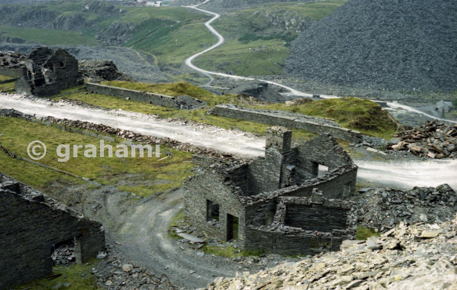 An odd incline which raised rocks to the mill on Floor 6 from the lower flowers down to Floor 2. Just in front of the office can be seen the weighhouse (with the blocked up window) of the Floor 6 adit. Cutting through the old stacking yard is the modern raod.