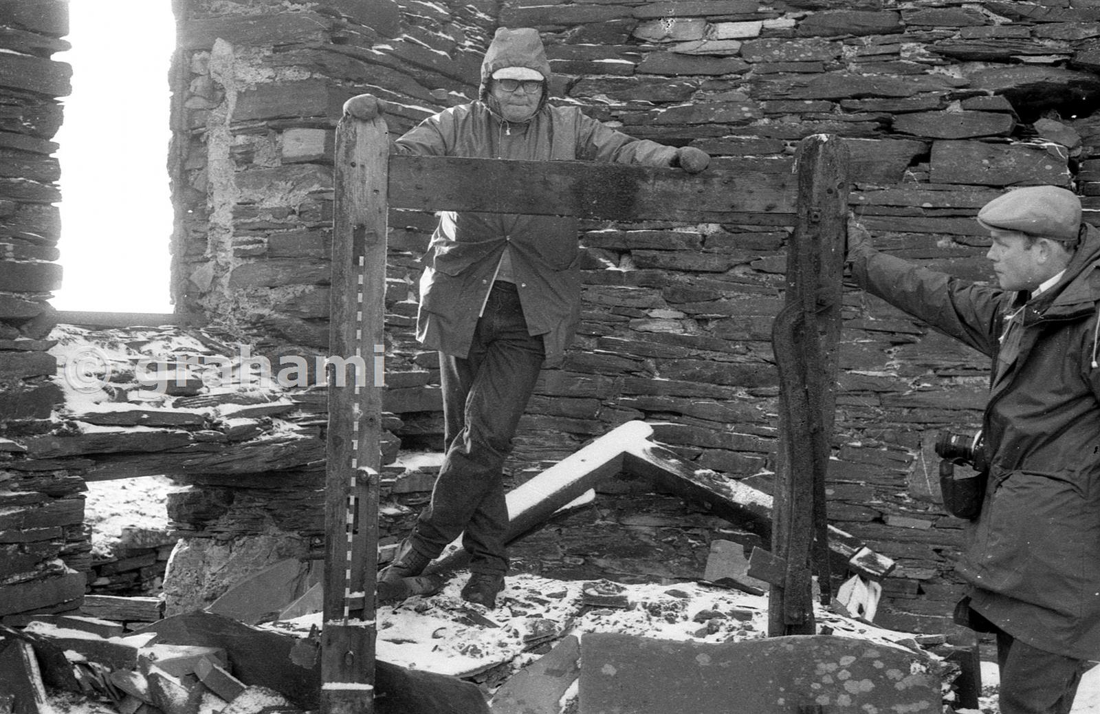 The side of a dresser is resurected for measurement - no it wasn't an unseasonal blast, we went back in December to check our ideas, having found the remains of the archetypal Mathews dresser in the ruins of Votty A Mill - this was different!