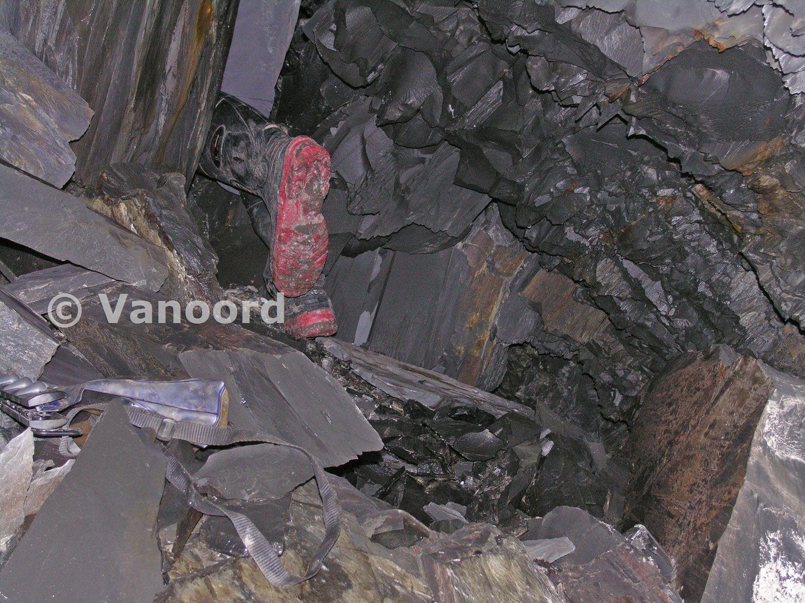 This is either Floor 8 or 9 and is the top adit of the main workings. It meets a chamber after about 20', which is utterly shattered. This did not, however, deter a certain brave individual from trying to see how far it goes...