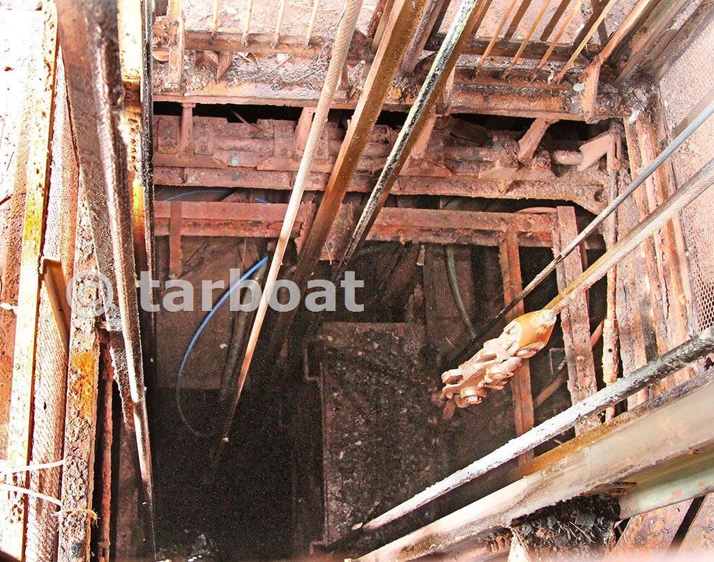 Looking down onto the cage at the Florence Ironstone Mine. Above the cage is the Humble patent detaching hook.