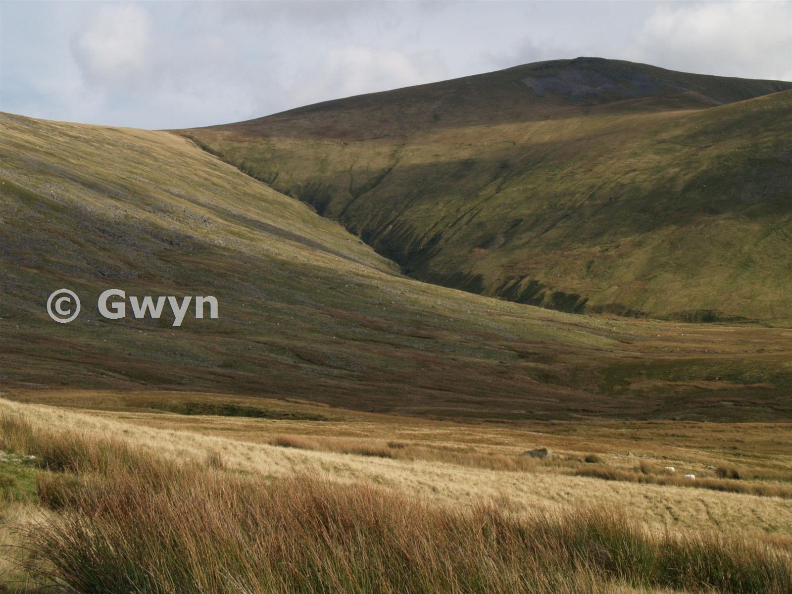 Landscape. Afon Wen is the scar/spoil heap on the slope to the right of the river ravine. Ochr Fwsoglog, with its revetment, is in the ravine. This attribution is based on Richards. 2007. Richards's attribution is now known to be incorrect. Afon Wen is in the river ravine, Ochr Fwsoglog, to the right, on the slope. Edited 25.1.09