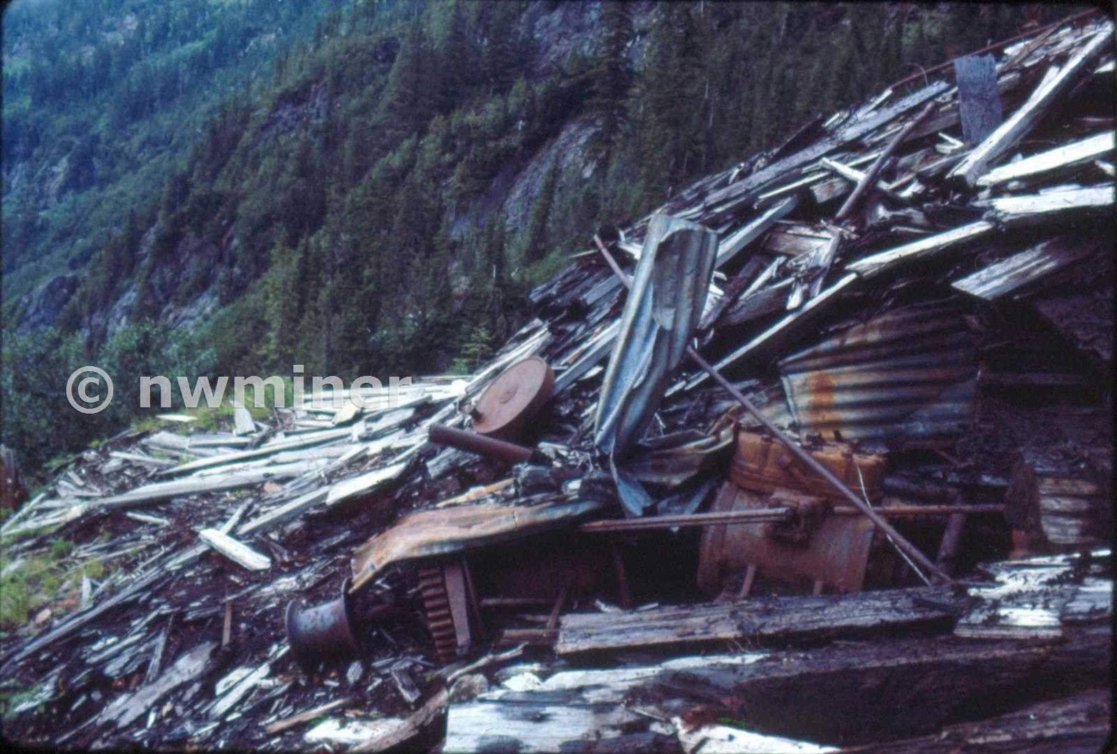 Old ruins on ledge, several dozen feet below main adit. Photo taken 1974.