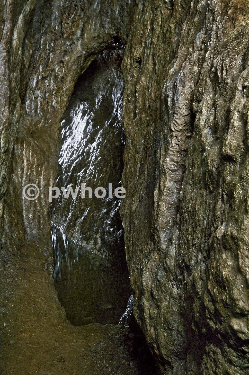 At the western end of the upper levels, the passage closes down at a forefield shortly after this pool. Nice piece of vein still intact above.