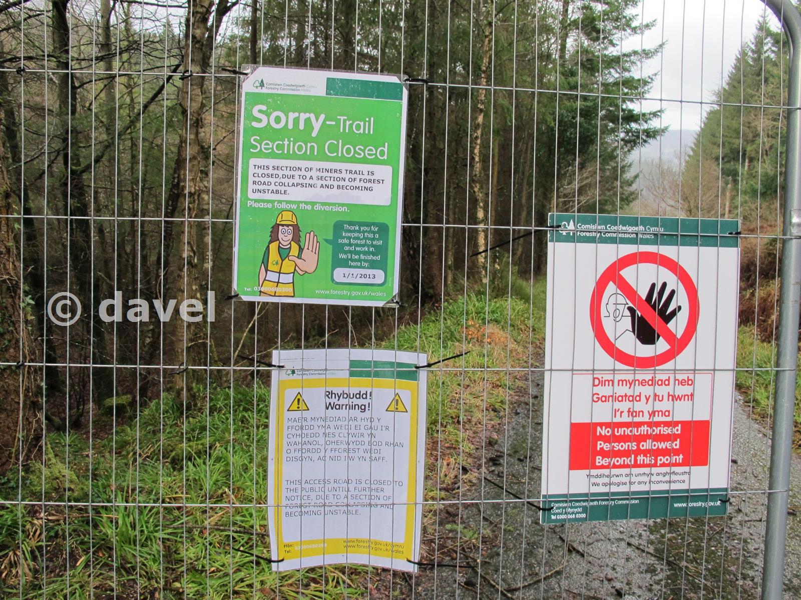 Forestry Commission signs at Parc Mine, Gwydyr forest, 14th February 2013, stating that the road is closed because of collapse and that work would be finished 1st January 2013.