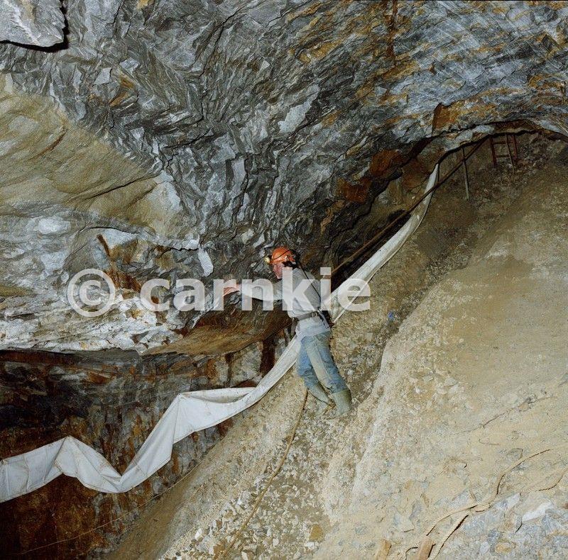 Foss Barite Mine, Aberfeldy, Perthshire. The stope of broken ore comes from a raise (a vertical or sub-vertical shaft) connecting the 630 m. level to the 660 m. level for ventilation and mining purposes. 630 m. level operations. Large F3 fold closure. Banding in the barite in the top right-hand side is vertical, banding on the left-hand side is horizontal. The fold closes around the figure's left-hand. Pyrite in the core of the fold can be seen in the top lefthand side of the picture. Photo P001560. Reproduced with the permission of the British Geological Survey ©NERC. All rights Reserved.