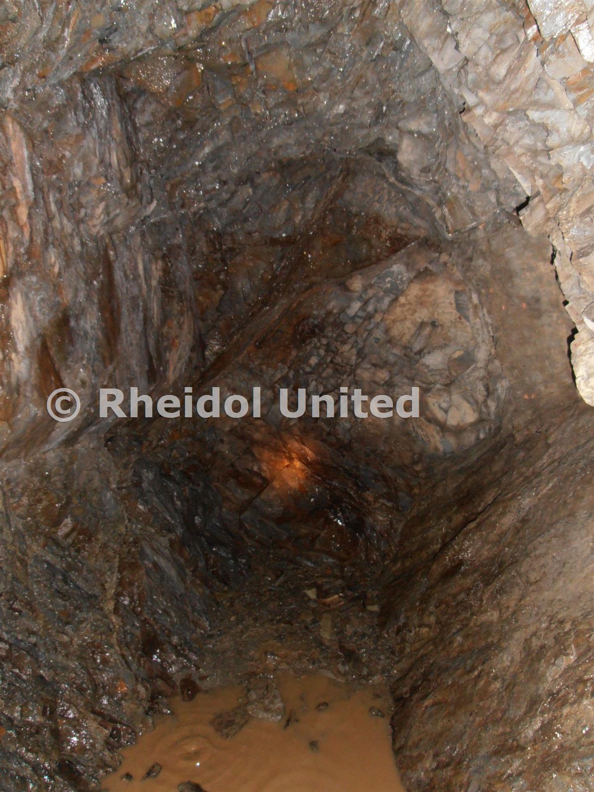 Unnamed trial adit West of the Foxpath adit. The end of drive with fine footwall and hanging-wall exposures in the sides of the drift.