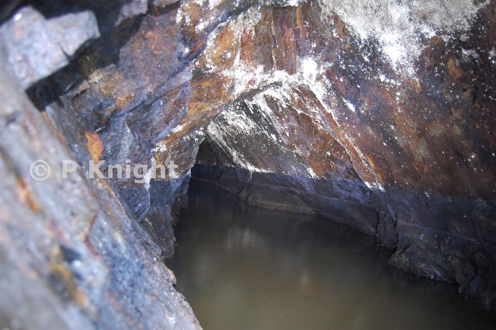 View toward the darkest depths of the mine. The shadow under water is the winze. ( I am not 100% sure about the shadow beyond the winze as one lacked the testicular fortitude to proceed any further on the day. )