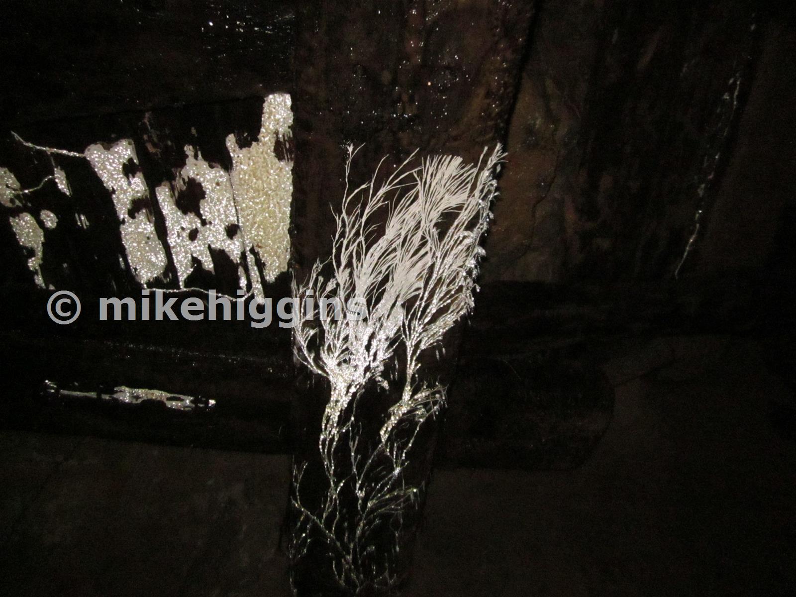Brilliant white fungus growing on the timbering near the winze