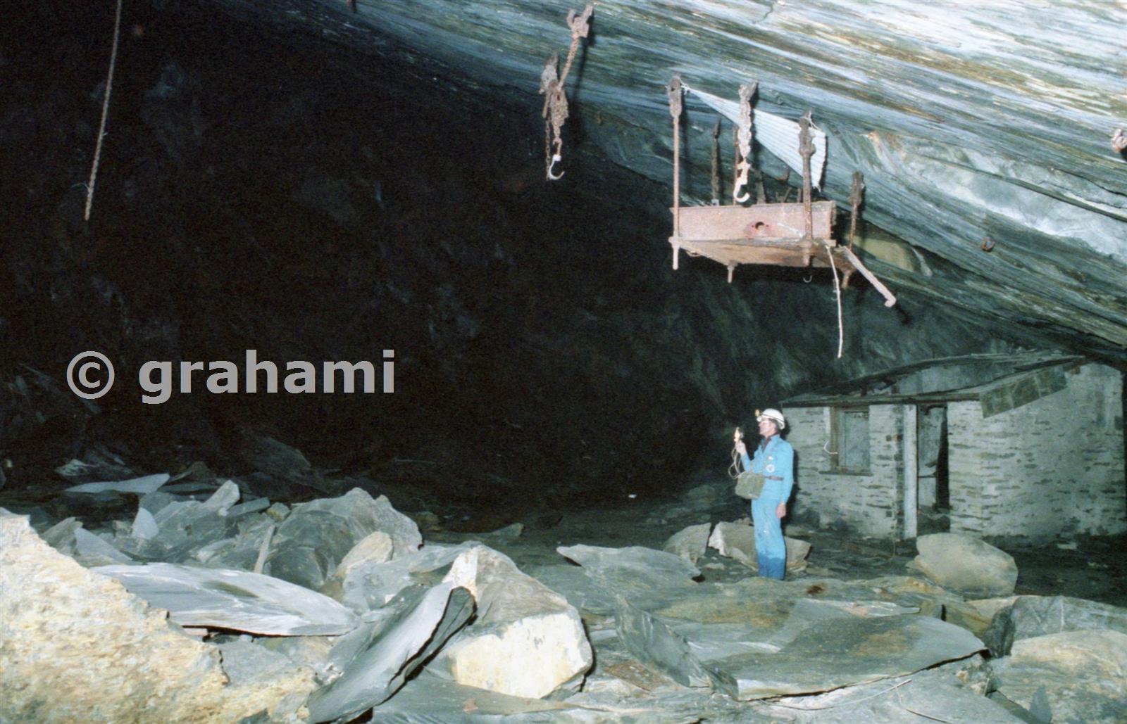 This was the "traffic centre" on G floor, from here levels led to the vertical balance shaft foot and beyond it to the North vein, levels went east and west and here too the draianage level began as well as the Archway level. The box suspended from the roof held electrical gear, as did the old sub-station in the background. This is the view looking west from the B series level.