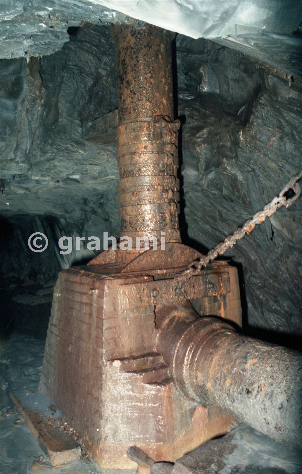 This is the point where the turbine pipe arrived at G floor down a shaft from DE. Notice the massive block (and chain) to take the shock of the valves being openend and closed.