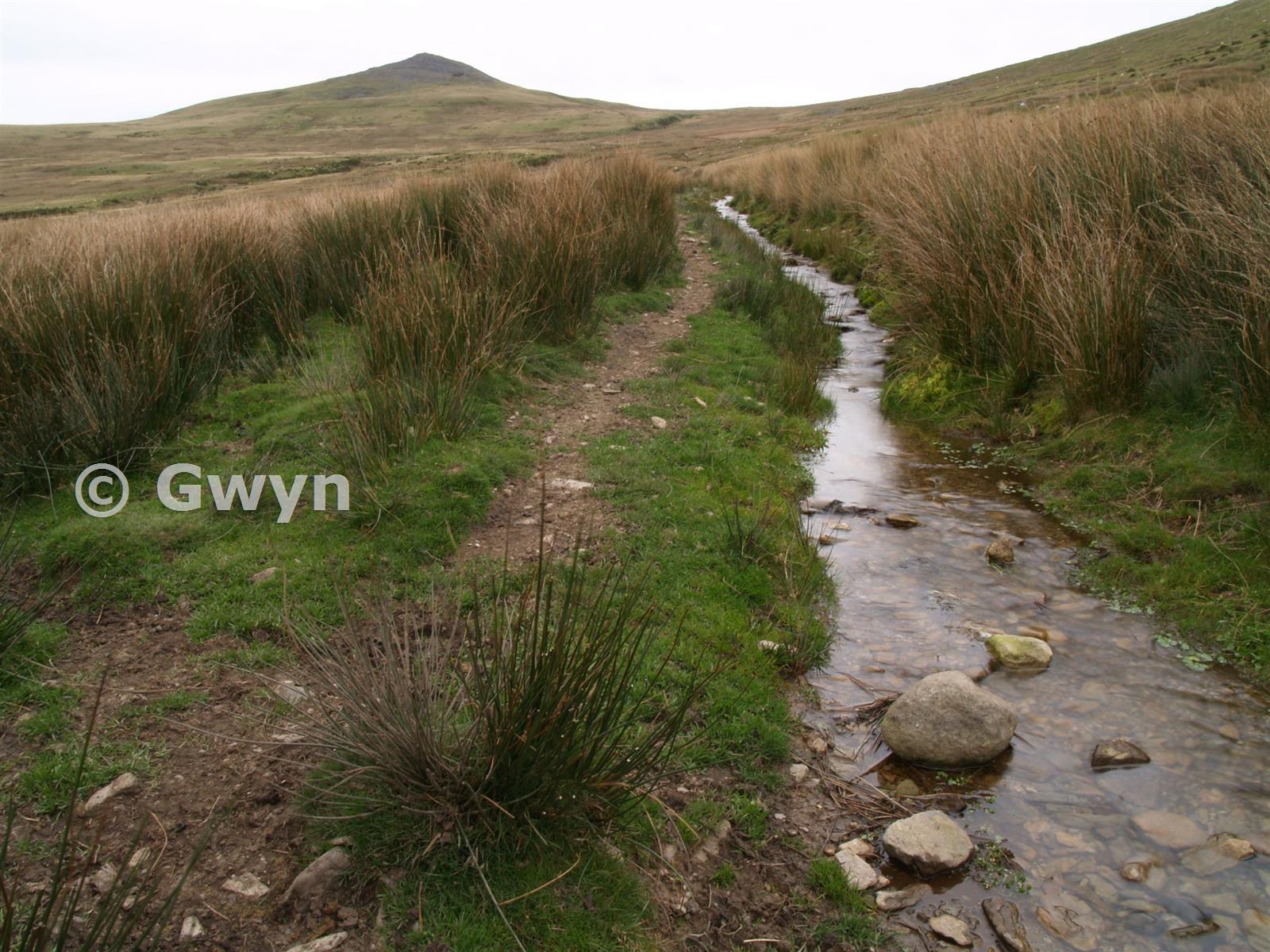 Landscape view from S.W. The working is just below the horizon, above path and stream. Gyrn in the distance.