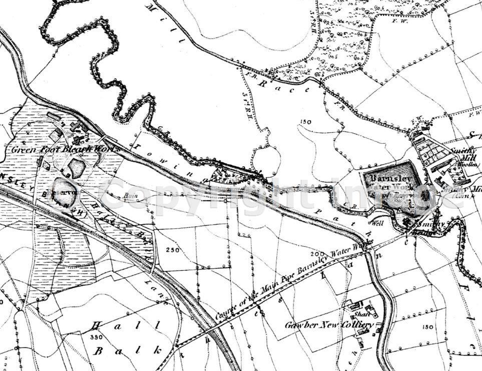 Extract from the 1850 6" Ordnance Survey map showing Gawber New Colliery next to the Barnsley Canal. The Barnsley Water Works reservoir is still in the modern landscape.