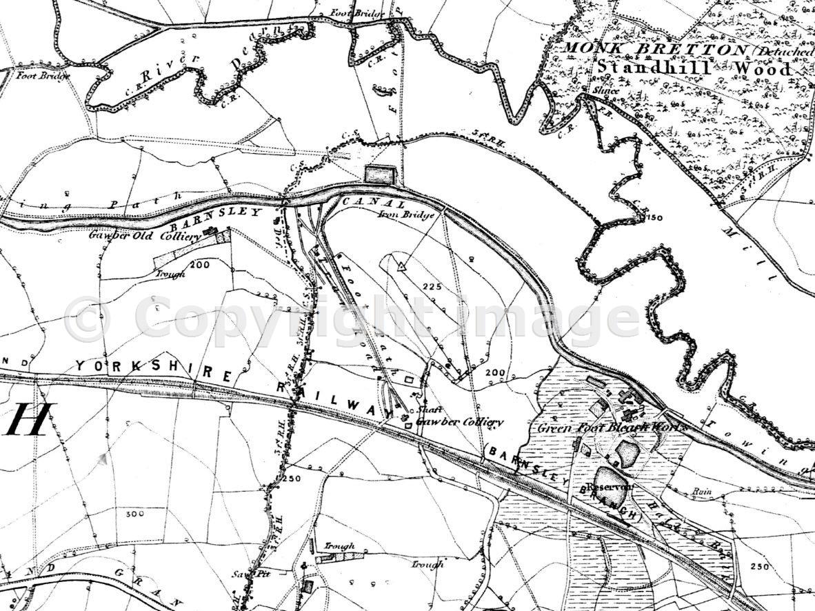 Map extract from the 1850 6" Ordnance Survey map showing Gawber Old Colliery alongside the Barnsley Canal. Gawber Colliery to the south-east net to the railway.