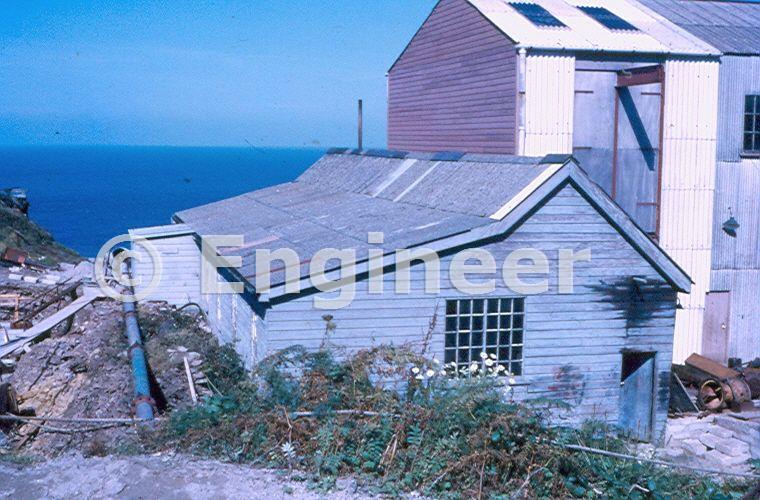 Old fitting shop at Geevor, befor a newer shop was built over it while it was still in use. The oily stain above the door is from one of the plummer block bearings of the line shafting that powered this workshop from one 10 HP motor
