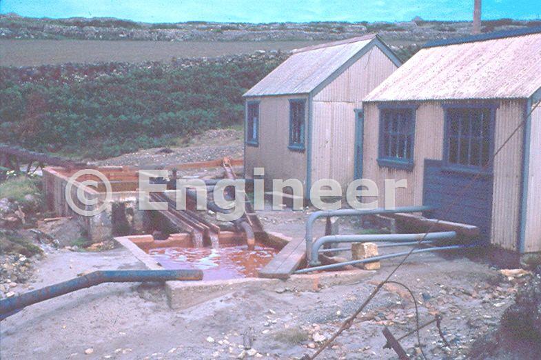 These pump houses contained a Harland "Duo-glide" two stage pump in the far pump house (Installed by Bob Orchard circa 1974). Prior to this it housed a "Aldrich Triplex Pump" triple ram pump made by the Allentown Rolling mills PA USA. Serial No. 1578. The near pump house contained a converted shaft sinking pump & a Mather & Platt pump. All pumps discharged into a common rising main to deliver water into the round tank adjacent to Victory shaft. The Harland pump was capable of 408 gall/min (when new). Water was also collected from a leat that ran around the cliffs for near Pendeen light house. Also we could pump the top 18" of water from Roscolors pond using a modified R.O. Stokes pump