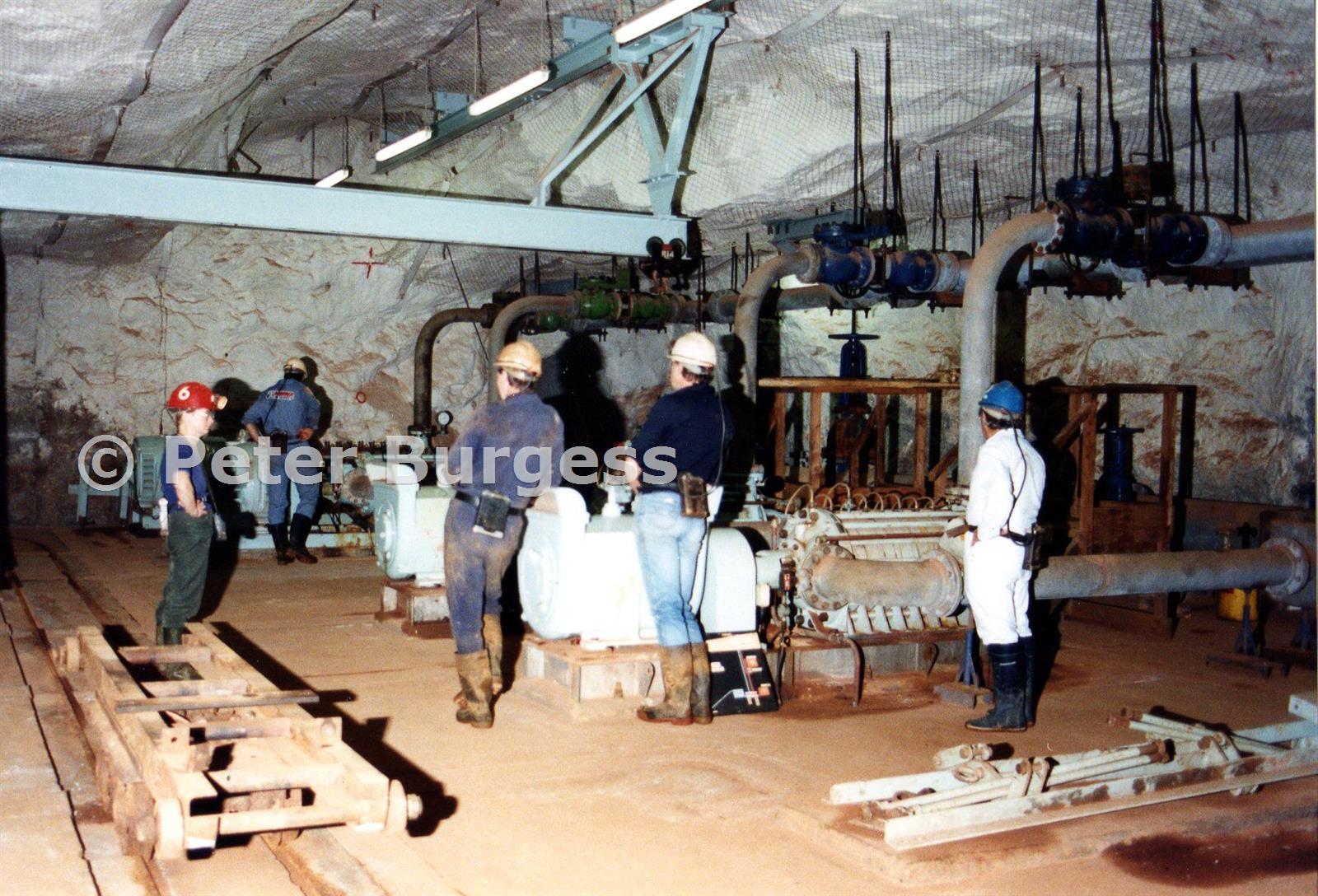 Pump Room on 15 level. Only one pump was being used at this time (November 1990) and only at night. The mine was exceptionally dry.