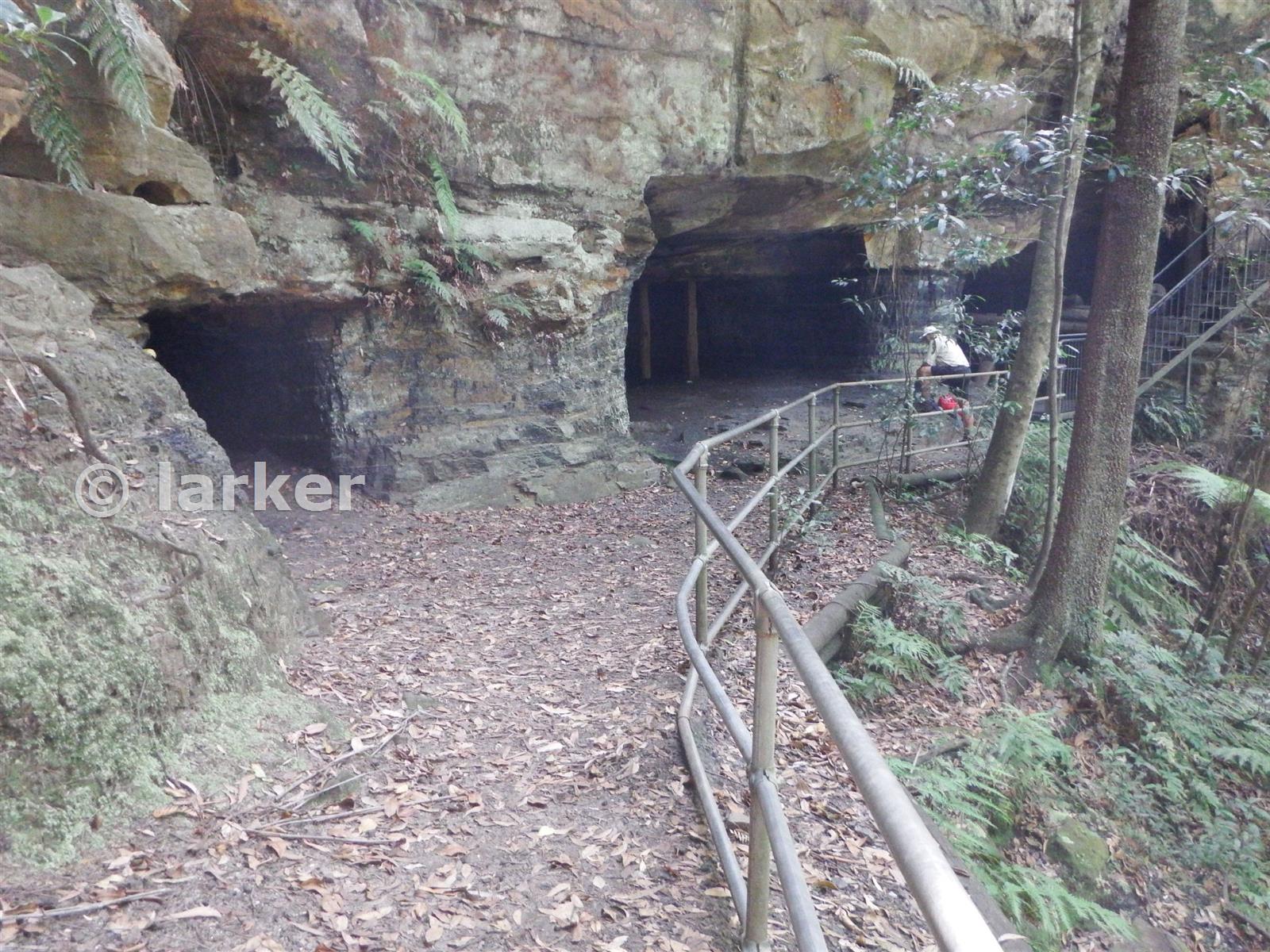 Location of the eastern adits. There is a further adit behind the trees on the right of the photo which was the main haulage adit. Just off to the right of the railings is the creek about 25m below the path level. There is also a waterfall to the right which must have caused flooding issues.