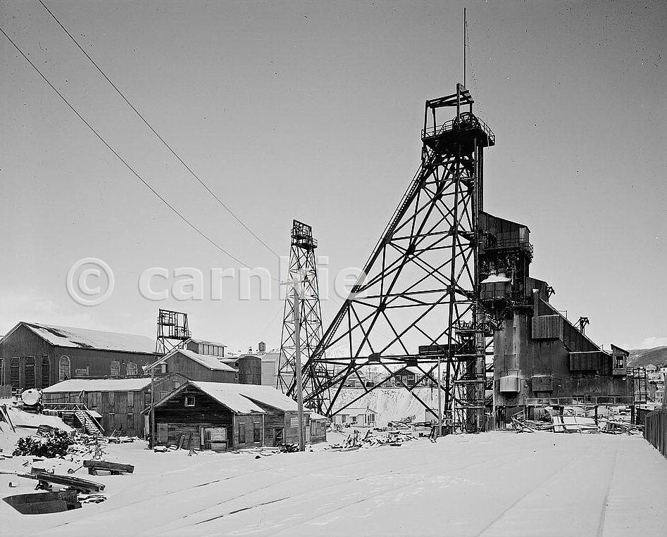 GENERAL VIEW OF THE ANSELMO MINEYARD LOOKING NORTHEAST. IN THE FOREGROUND IS THE CARPENTER'S SHOP. BEHIND IT AND TO THE LEFT ARE THE DRIES (THE LEFT HALL PREDATES THE STEEL HEADFRAME, THE RIGHT HALL WAS BUILT LATER). DIRECTLY BEHIND IS THE CHIPPY HOIST, AND TO THE LEFT IS THE MAIN HOIST. THE TANK BETWEEN THE CARPENTER'S SHOP AND THE MAIN HOIST IS A COMPRESSED AIR TANK. Courtesy Library of Congress, Prints & Photographs Division, HAER, Reproduction number HAER MONT,47-BUT.V,1-A-25