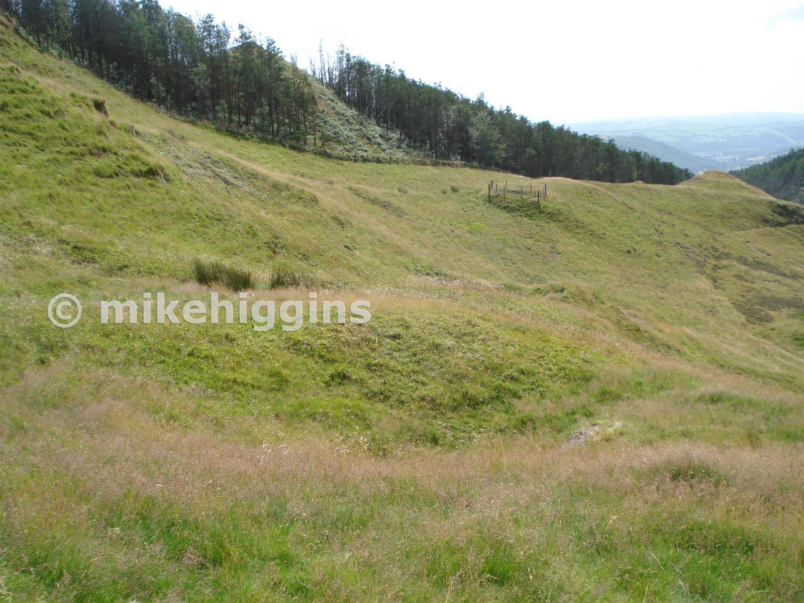 Looking along minor workings on the vein west towards Bwlchyrennaid Shaft (note leat running along the right of the photo).