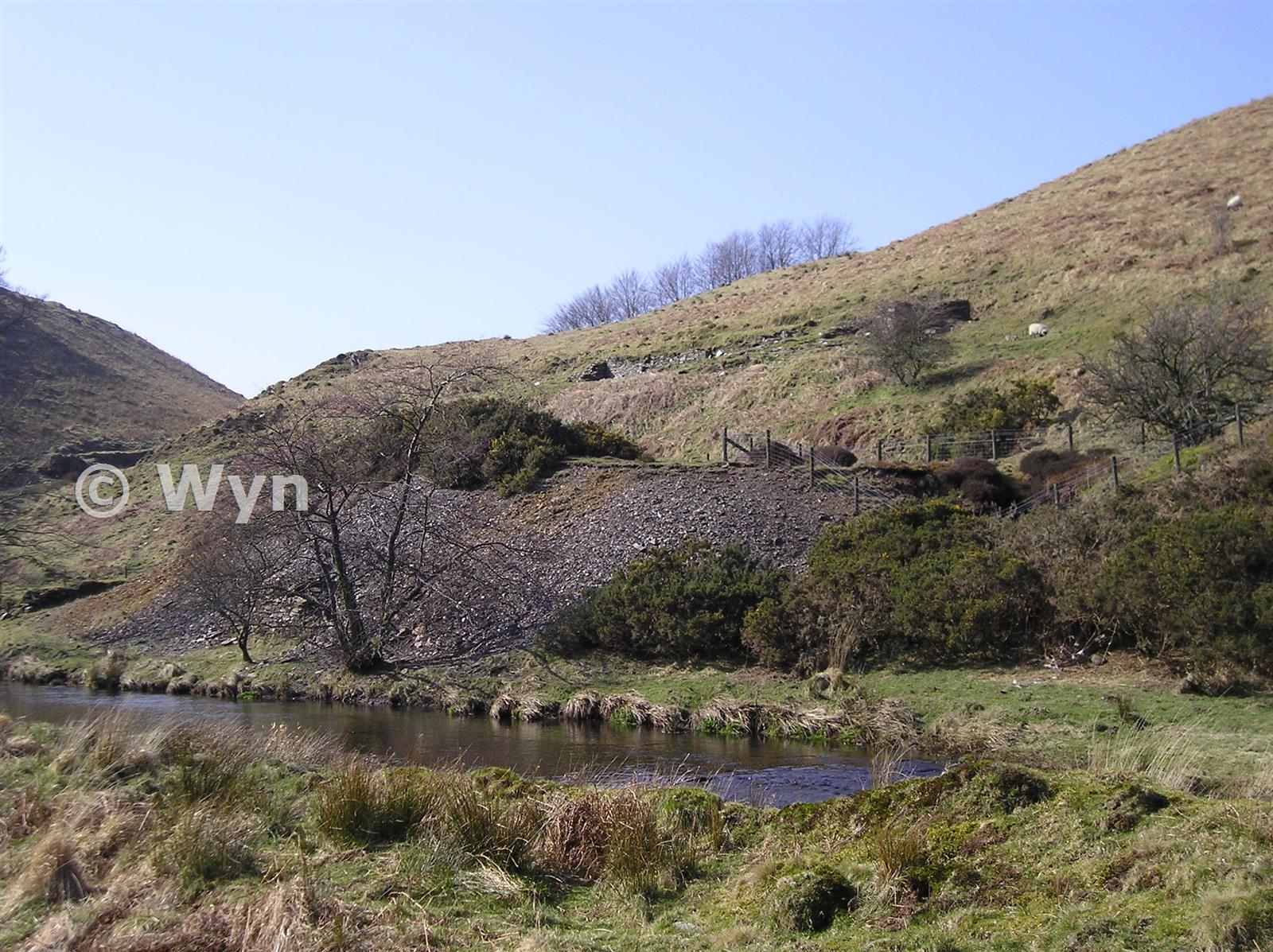 General view of mine from across the River Barle, showing dumps, shaft to the right and remains of buildings higher up.
