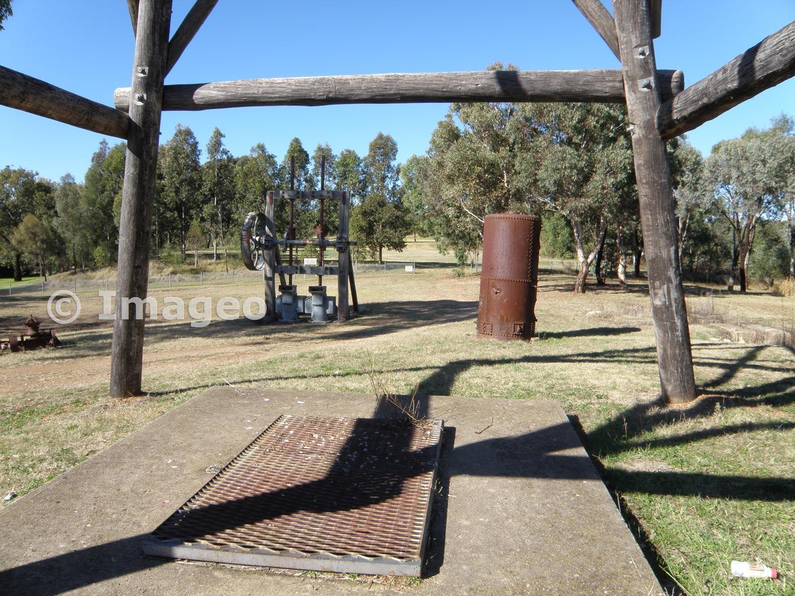 View through the headframe legs showing shaft collar, old boiler and two head stamper.