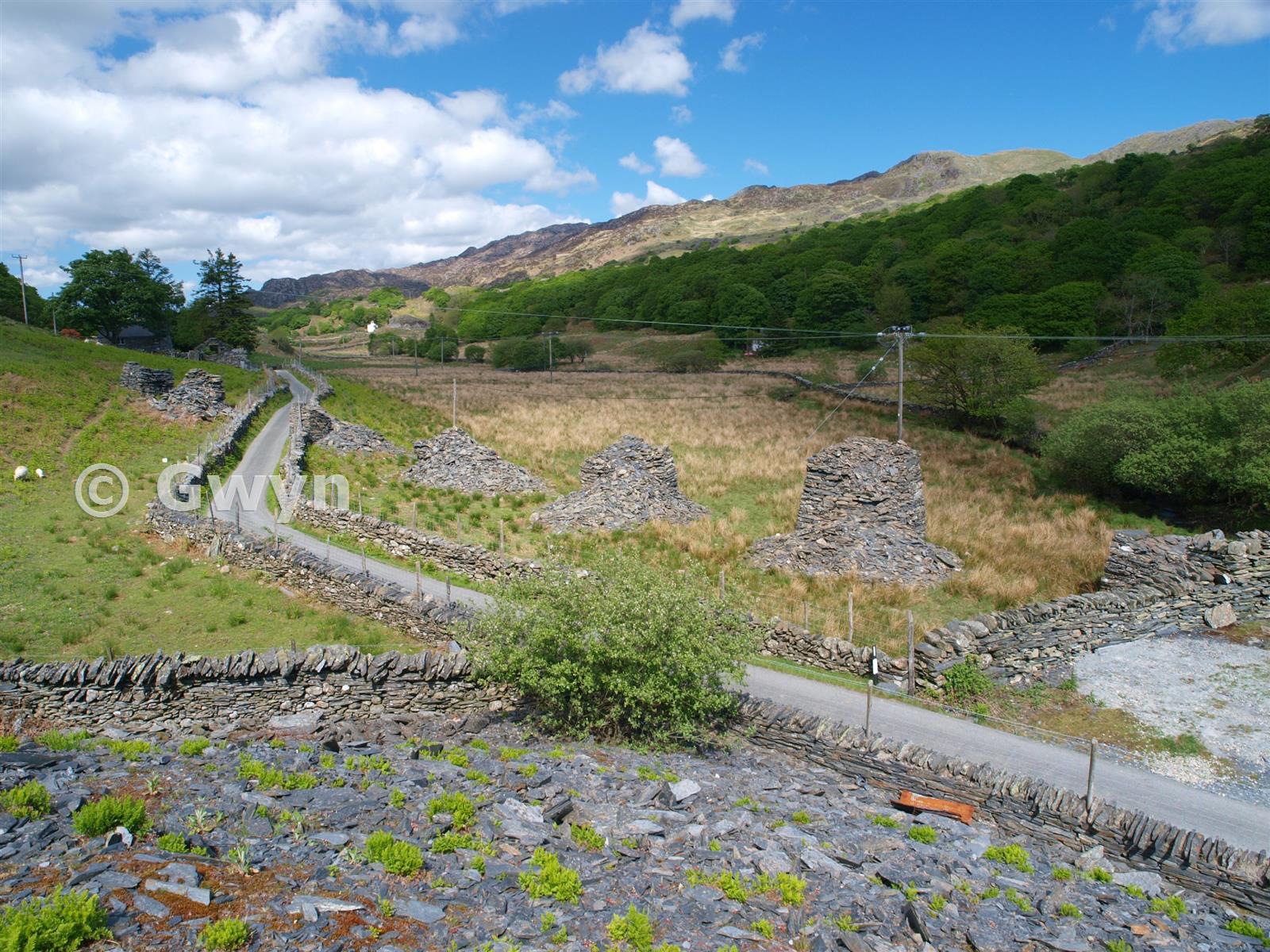Landscape looking NE. up Blaen Nanmor. The stone structures are assumed to be the delapidated remains of launder pillars that served the site mill. The site was subject to "landscaping" works in the 1990's when the mill and other features were removed.
