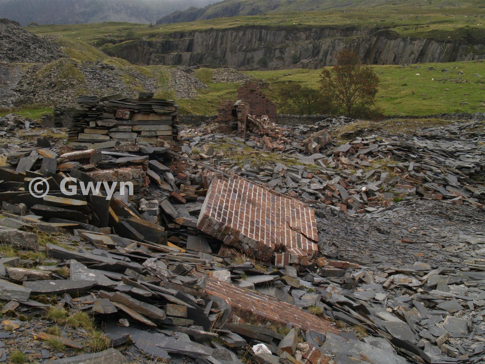 View of the mills area. The low, block pillar, on the left, is a modern, play construction. Lumps of fused clinker and slag, as well as the collapsed brick work, suggest this was the smithy area. See Richards's description of the site.