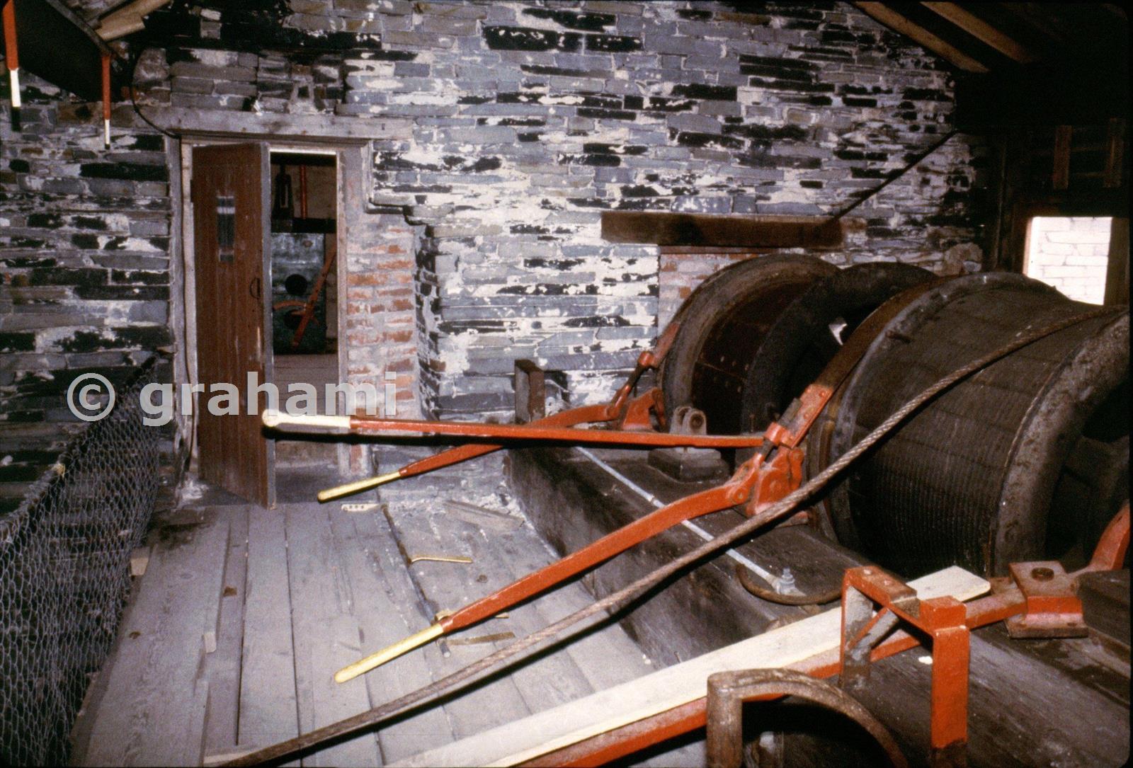 This is a view of the incline "stage" with the drums and levers etc. from the "C Incline" - which is why things look a bit droopy. We never got round to manufacturing appropriate supports etc. The foot pedals, which used to work the safety brake and scotches, are original, however.