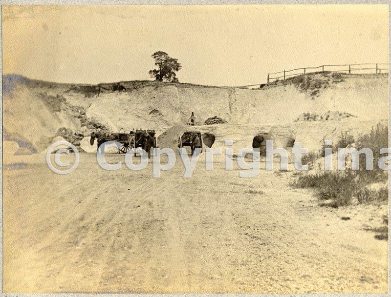 From the NERC photographic collection Photo P238369 Reproduced with the permission of the British Geological Survey ©NERC. All rights Reserved. Photographer H.W.Milne. Caption: Godstone, W. of main road in village. Folkestone Beds in Lower Greensand. This photo shows the large village sand pit with older mine galleries exposed in the sides.