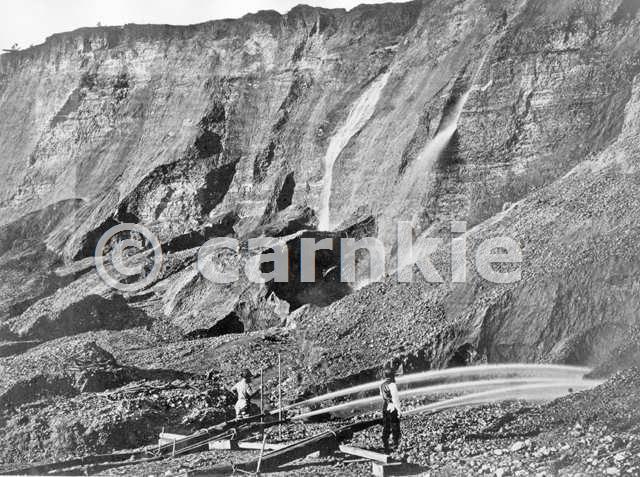Gold miners excavate an eroded bluff with jets of water at a placer mine in Dutch Flat, California sometime between 1857 and 1870.