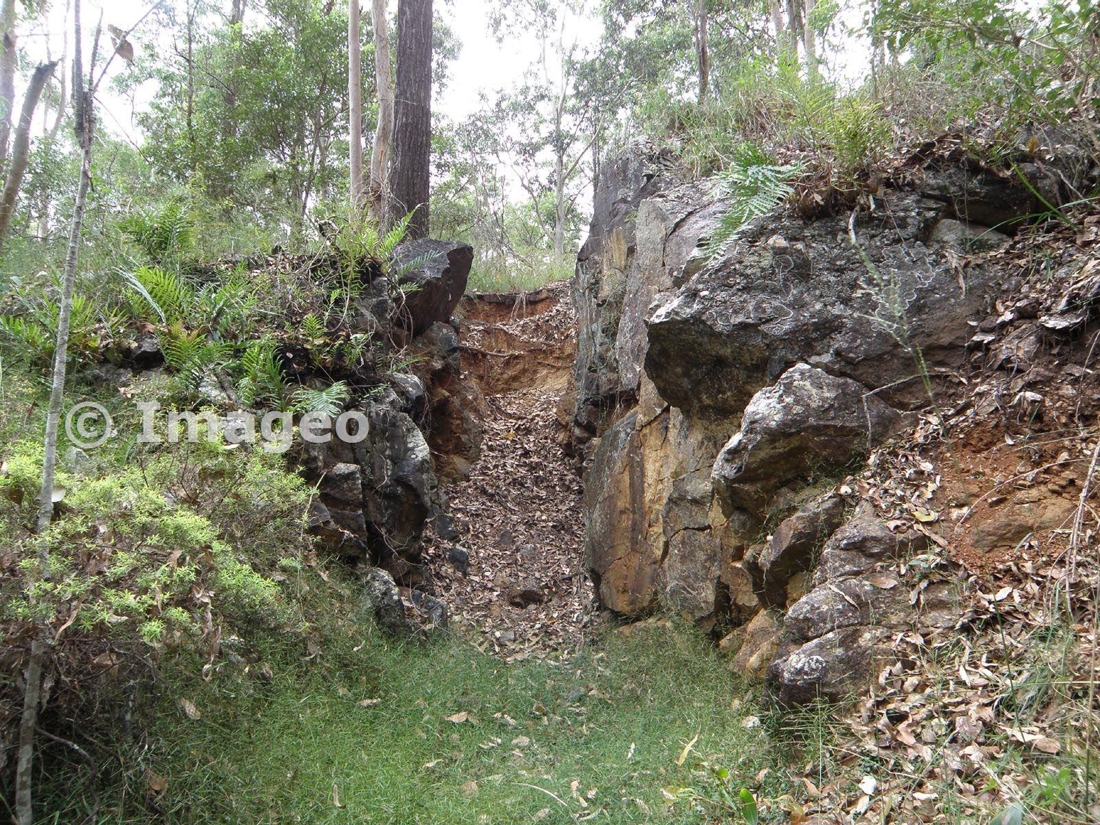 The small open-cut at Golden Boulder northeast of the shaft. Weathered pyritic quartzitic 'ore' can be seen in the right hand wall.