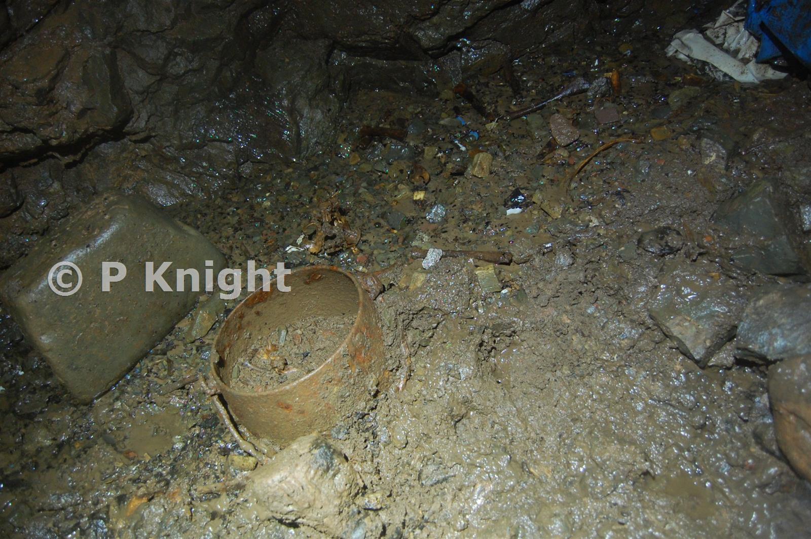 A pot and various bones in mud. Quite a disturbing place. Not photographed is the immense pile of bones just to the right of this picture.