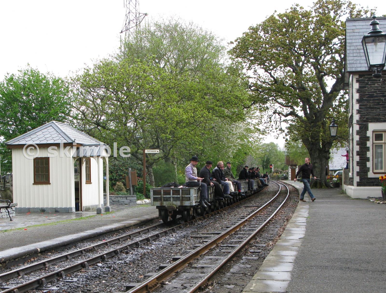 The leading brakesman of the slow-moving train has just received and is checking the staff for the Minffordd - Porthmadog section while the brake is being released on the next waggon back. 25/04/2009