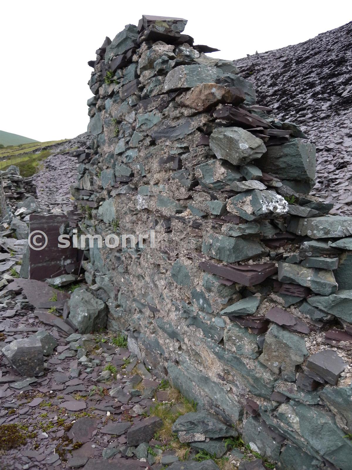 Green slate in ruined building wall Cefn Du slate quarry July 2012
