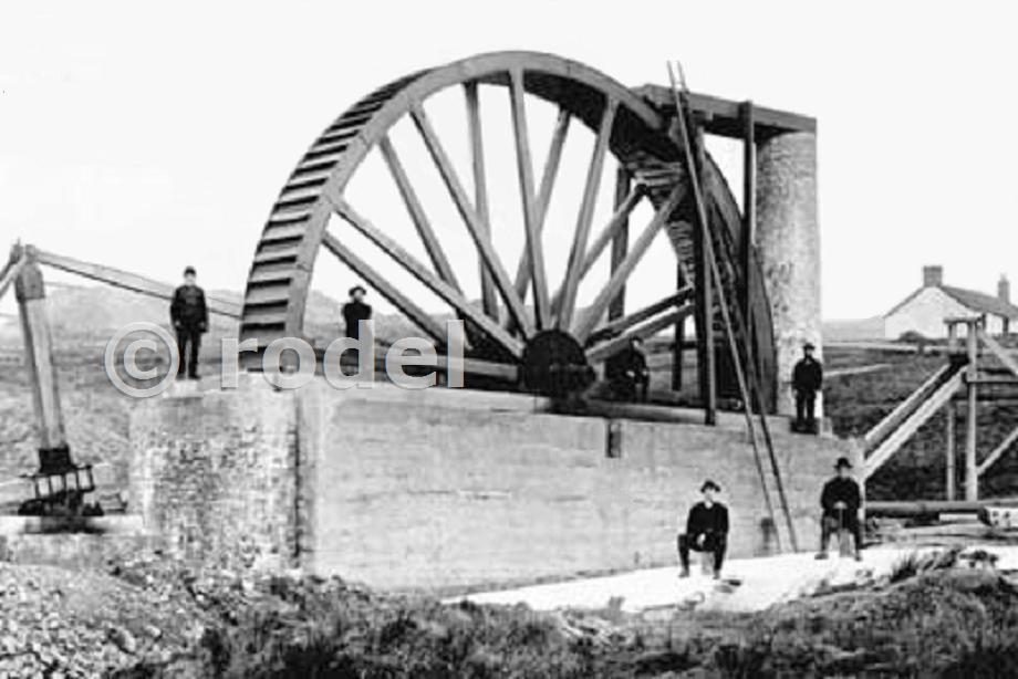 The construction of the wheel at Greenhurth circa 1880 with the managers house and the flat rod system behind. A wheel of this size (40ft dia ?) was necessary to operate the flat rod system which had to travel up the side of the valley to the pumps in the newly sunk Swan's shaft 500yds away.