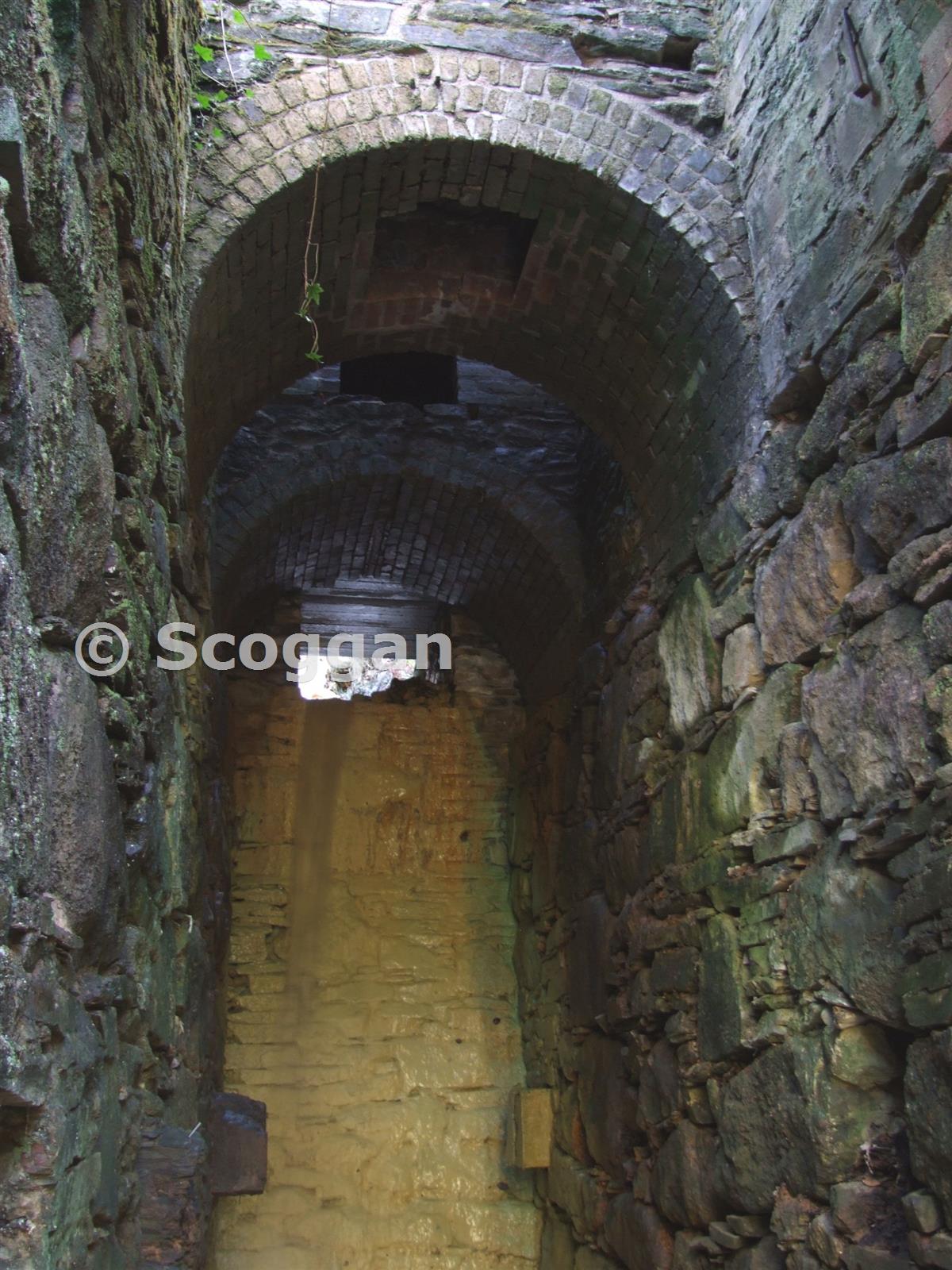 Inside the wheel pit at the riverside Engine House whitch used the masonary for the engines crankshaft loading, note the staining of the back wall where the Adit drains through the Engine House. 17-03-13