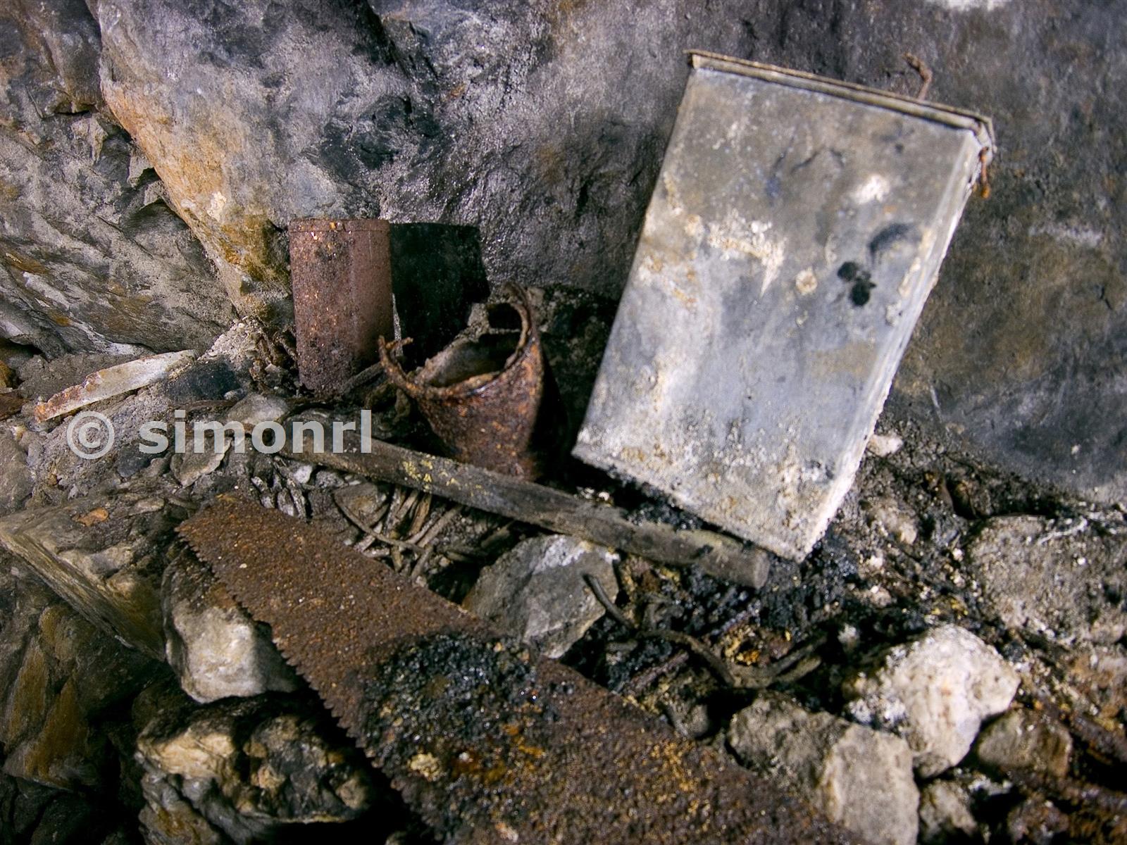 Gunpowder box, saw and other artifacts, 40 yard level Snailbeach Mine 06/06/2009