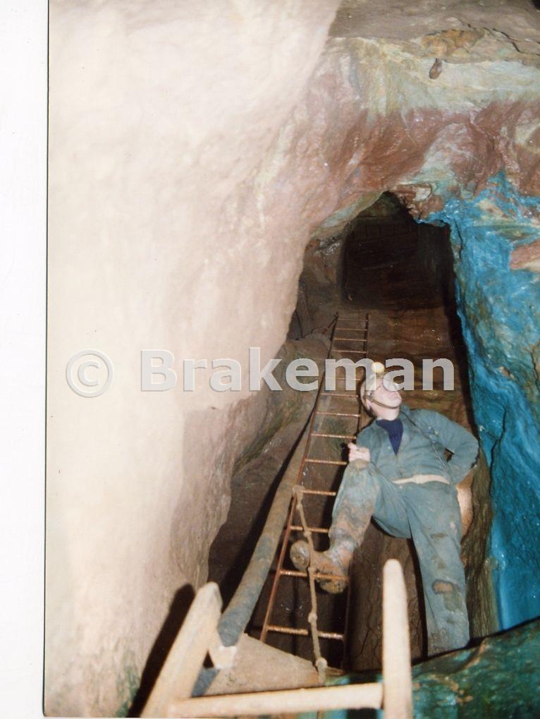 Steve Mills half way up the Blue shaft on the ladder change over, circa 1987