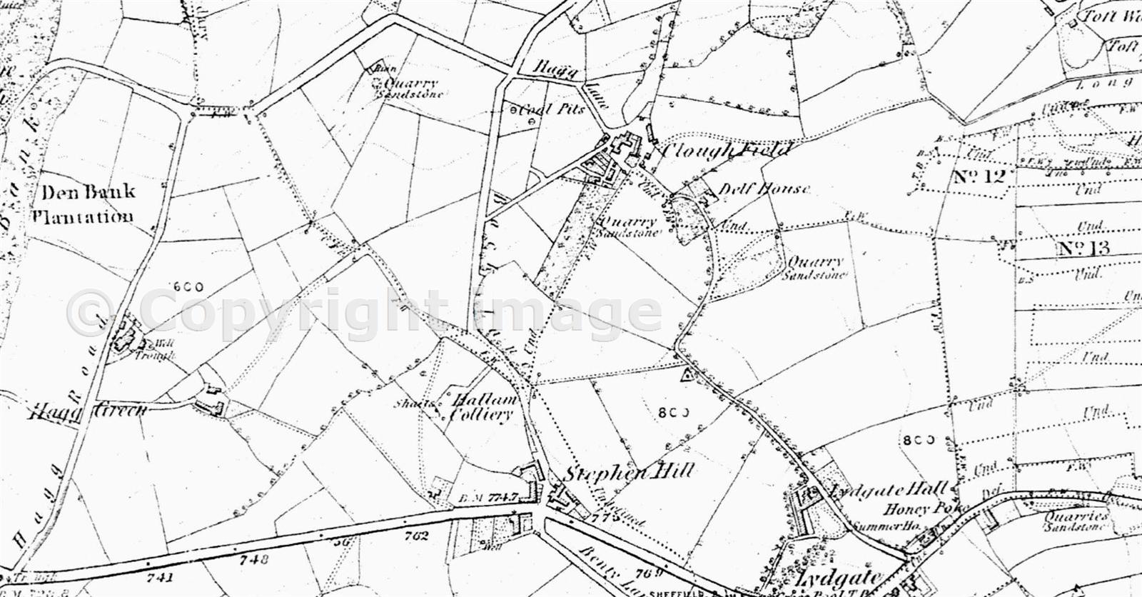 Ordnance Survey map extract from 1850 showing Hallam Colliery and two more coal pits a little further north close to the junction of Back Lane and Hagg Lane.