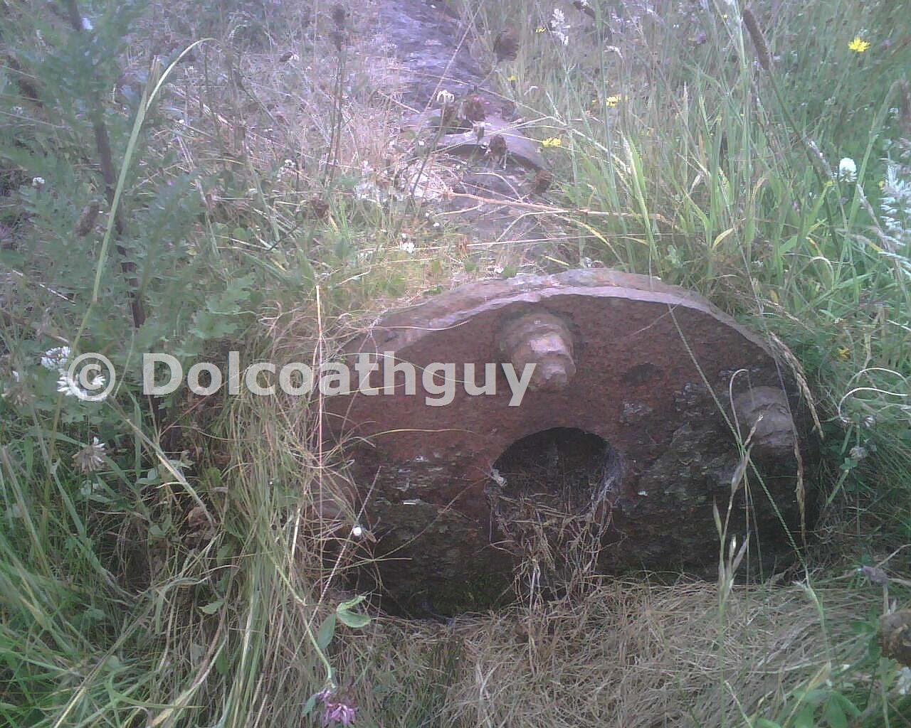 All undergrowth has died back revealing flange and bolts on old pipe by foot of concrete winder mountings at Harriet shaft Dolcoath.
