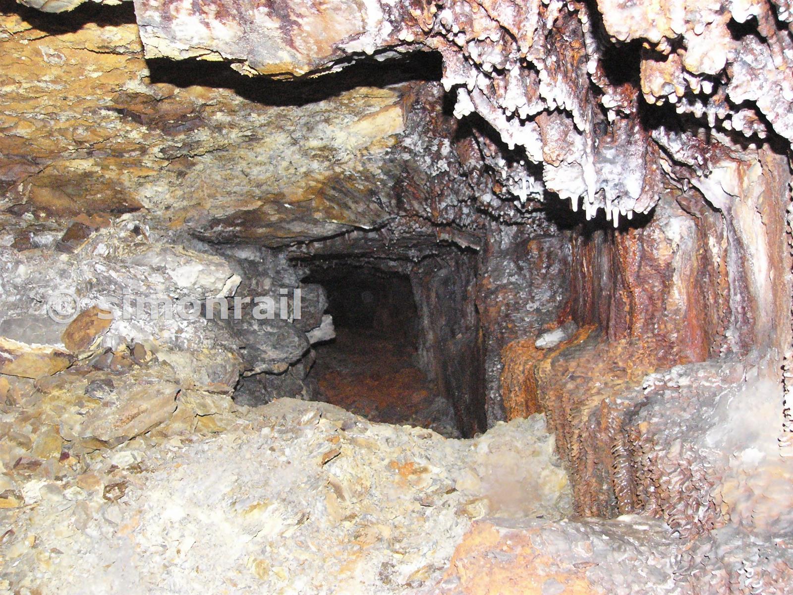 Opening into the Pecten seam which goes about 30 feet to a complete blockage. The width has been much reduced by packing with waste shale (to the left).