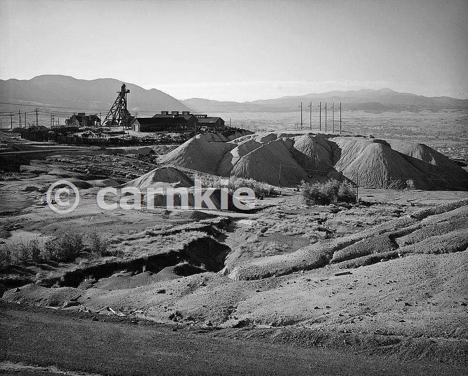 .VIEW OF THE DIAMOND HEADFRAME LOOKING SOUTHEAST FROM THE TOP OF BUTTE HILL. THE DRIES ARE ON THE LEFT, WITH THE TAR HOUSE, TOILET, AND ROPE CLAMP CLEANING TO THE RIGHT Courtesy Library of Congress, Prints & Photographs Division, HAER, Reproduction HAER MONT,47-BUT.V,1-B-19