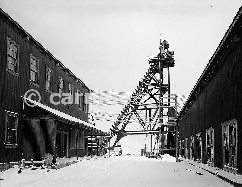 VIEW OF THE DIAMOND HEADFRAME, LOOKING EAST. THE ROPE HOUSE ON THE RIGHT WAS USED TO SEW FLAT CABLE, DRIES ARE ON THE LEFT. Courtesy Library of Congress, Prints & Photographs Division, HAER, Reproduction HAER MONT,47-BUT.V,1-B-7