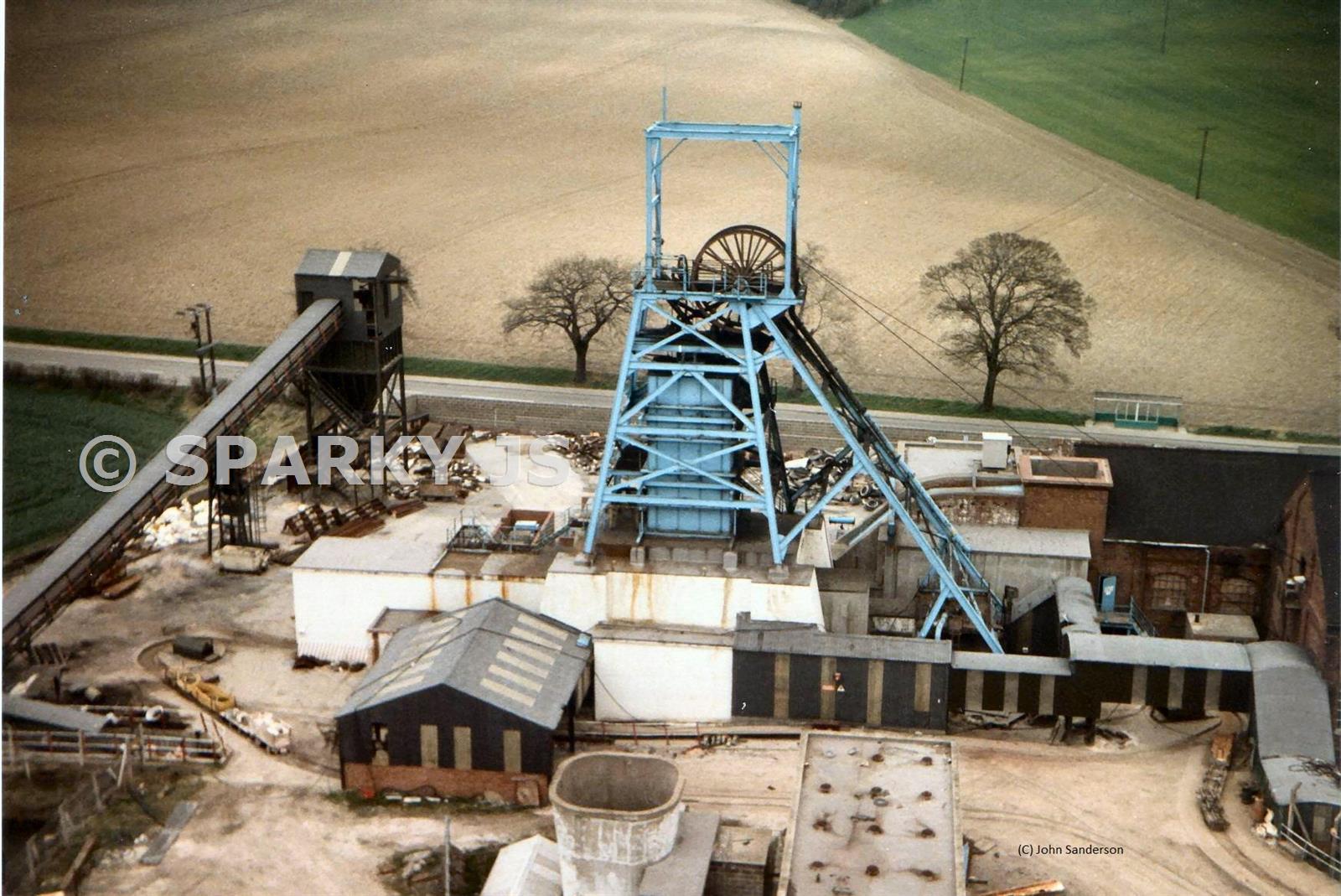 The circular concrete building being the stand bye fan house.To the right of the shaft was the "new", fan house.The covered building in the fore ground was a tippler, which loaded stone on to conveyors which took it into the hopper on the left. Which was then loaded into lorries.This & other other equipment was installed to remove "waste", from the mine, created by the development of the Haigh Moor seam.Despite spending millions, the coal faces had major geological faults & couldn't be worked.This meant closure in 1985, a sad day for many. (If I remember rightly. I had to climb up a floodlight tower, to get the shot).