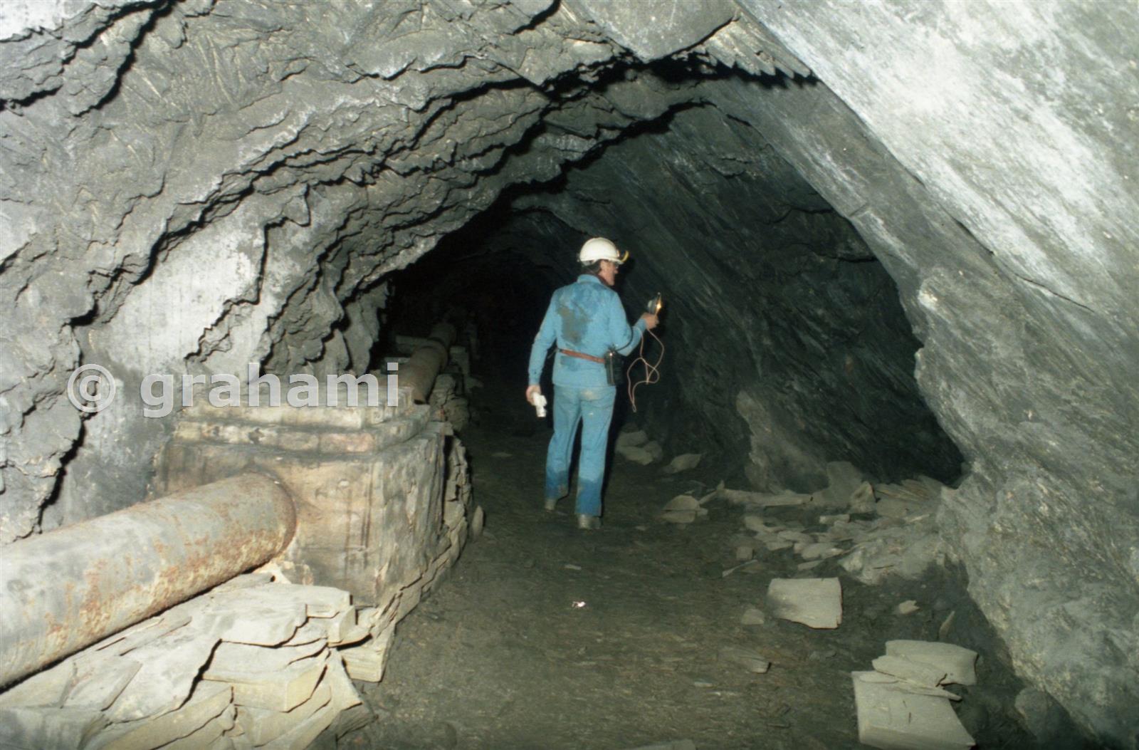Following the "Old" Sulzer main pipe west as it rose above the floor, supported on slabs there were levels on the right into the tops of more flooded chambers. Here Will is shining my 40Watt car spotlight into B3 (No LED thingies in those days!).