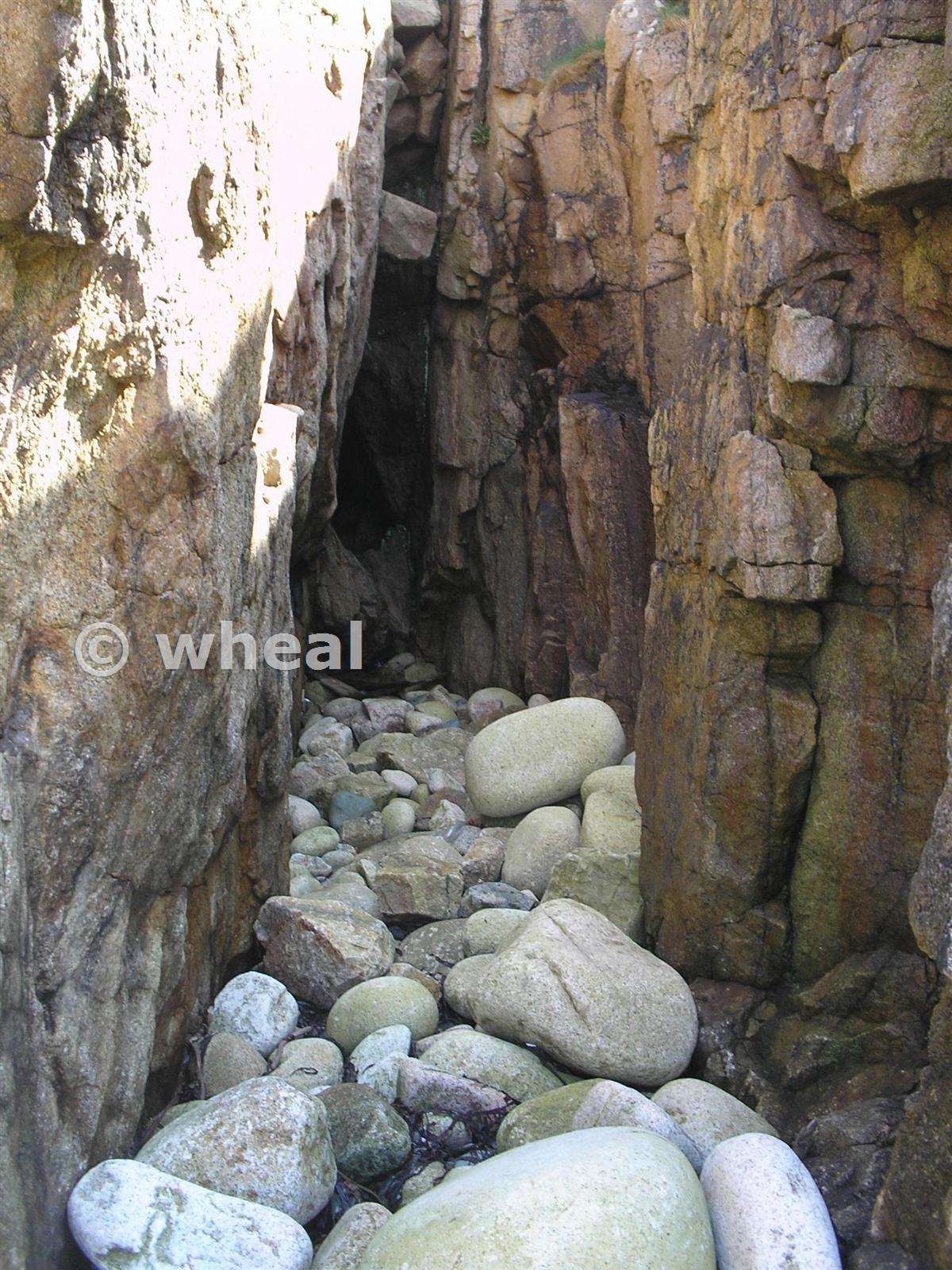Workings leading in from the beach with the 'famous' Cot Valley white granite boulders.