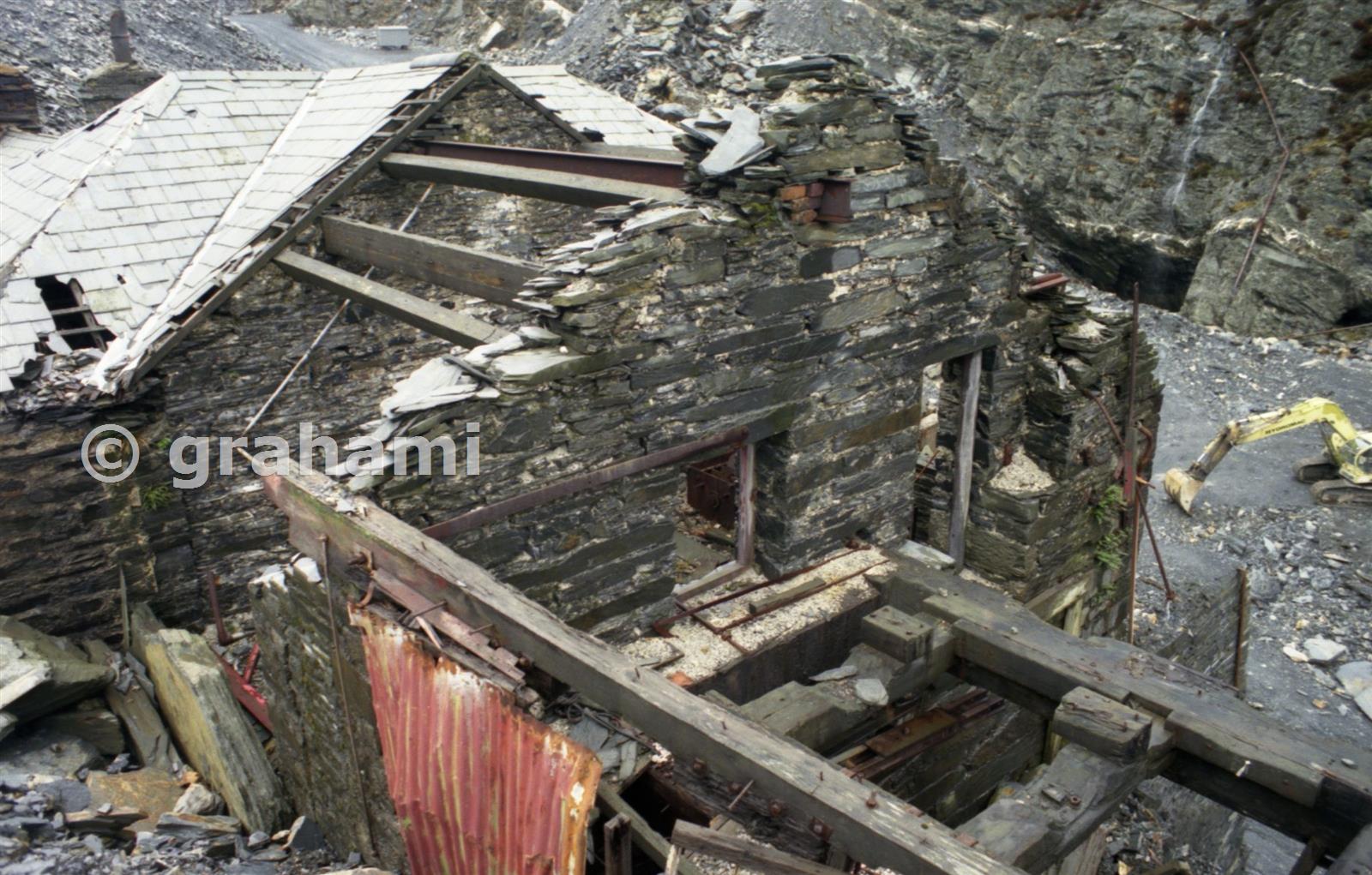 From left to right are the (roofed) compressor shed (ex-boiler house), the (roofless) incline motor and control house, and then the drumhouse. The landing for this incline was so short that the winding ropes were taken backwards from the drums above the DE floor tramways, round a set of sheaves and then back under the drums again to the crimp!
