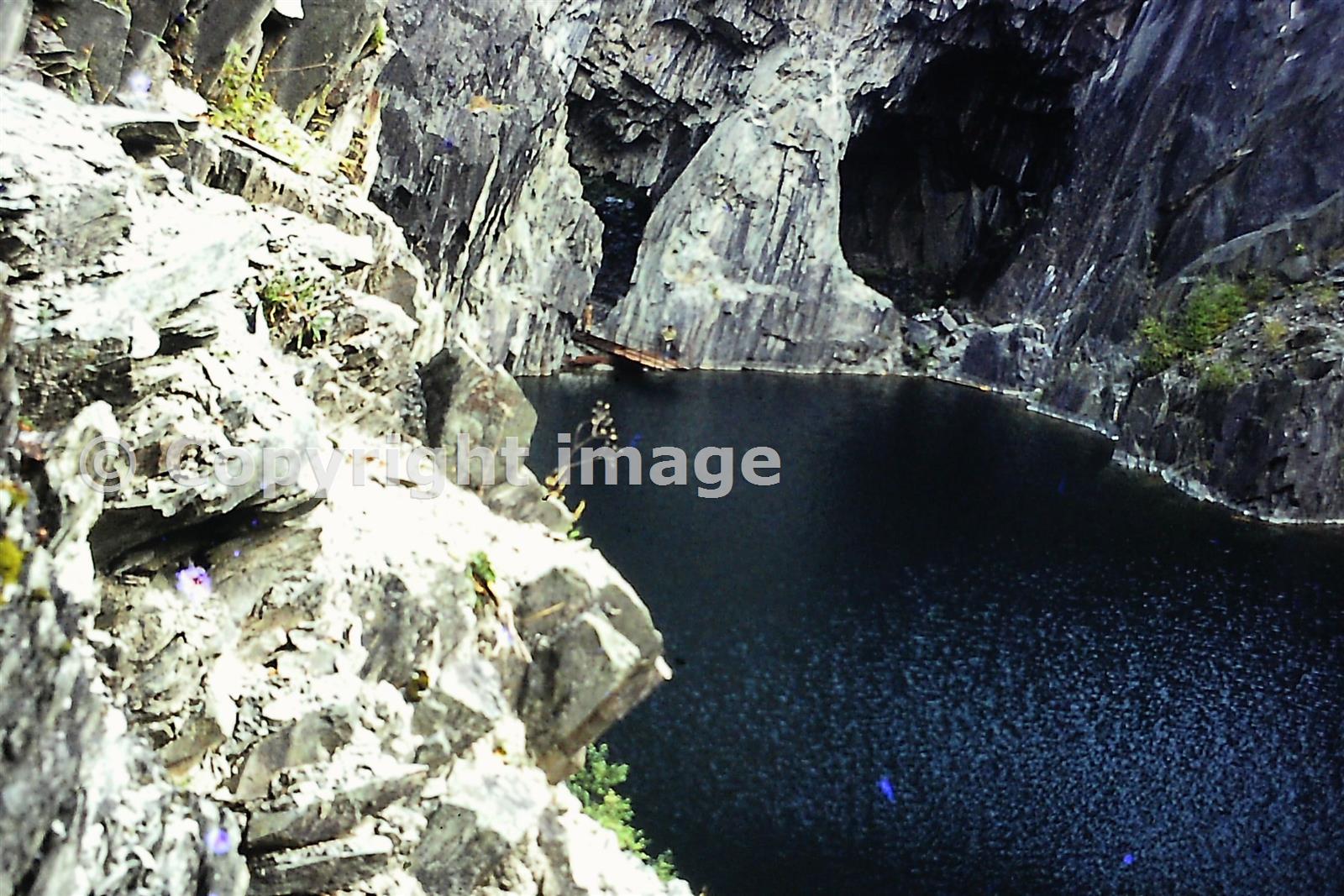 View of flooded workings at the quarry, remains of staging, with two explorers inspecting it, just above the water level ( it looks a little more intact than GavinNewcombe''s pic in the archive). Presumably the same staging as Captain Scarlet''s 2007 pic looking out from the underground chamber in the current album.